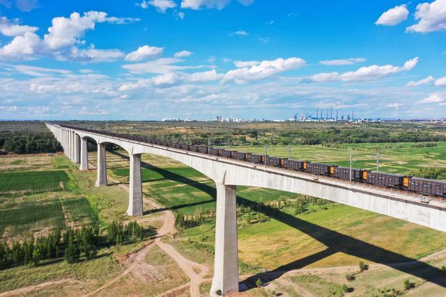 這是在準格爾旗境內拍攝的運煤專列(7月8日攝,無人機照片)。