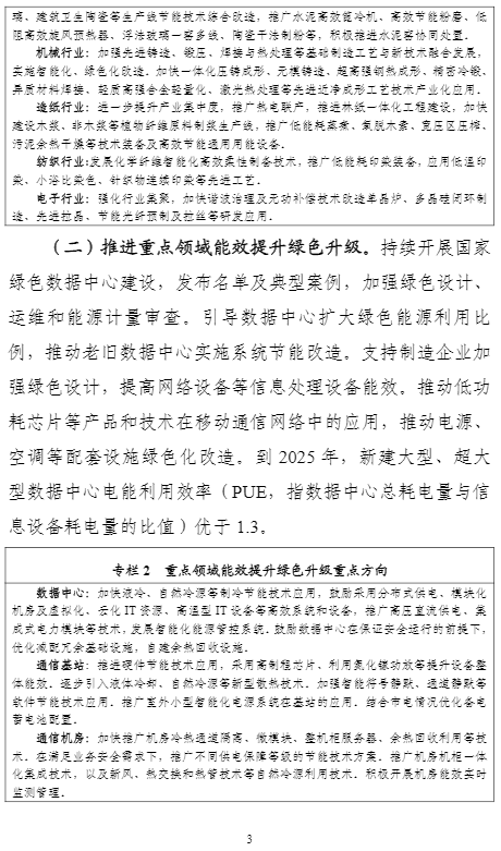 計(jì)劃提出,到2025年,重點(diǎn)工業(yè)行業(yè)能效全面提升,數(shù)據(jù)中心等重點(diǎn)領(lǐng)域能效明顯提升,綠色低碳能源利用比例顯著提高,節(jié)能提效工藝技術(shù)裝備廣泛應(yīng)用,標(biāo)準(zhǔn)、服務(wù)和監(jiān)管體系逐步完善,鋼鐵、石化化工、有色金屬、建材等行業(yè)重點(diǎn)產(chǎn)品能效達(dá)到國際先進(jìn)水平,規(guī)模以上工業(yè)單位增加值能耗比2020年下降13.5%。能盡其用、效率至上成為市場主體和公眾的共同理念和普遍要求,節(jié)能提效進(jìn)一步成為綠色低碳的“第一能源”和降耗減碳的首要舉措。