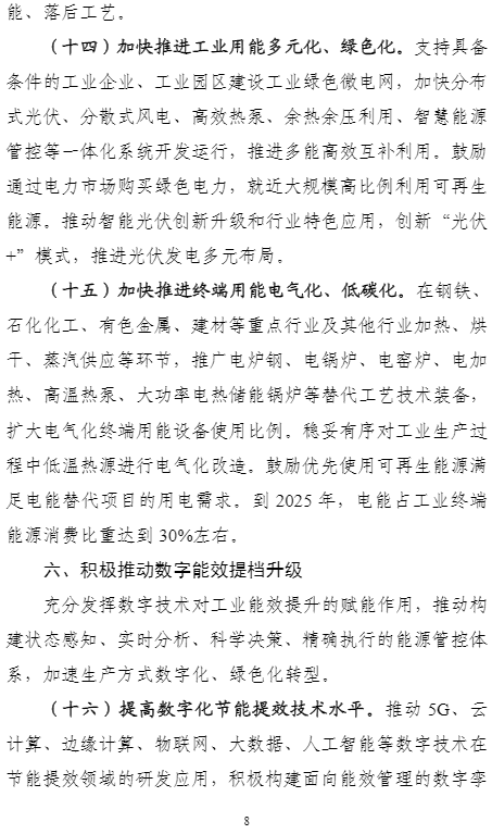 加快推進(jìn)終端用能電氣化、低碳化。在鋼鐵、石化化工、有色金屬、建材等重點(diǎn)行業(yè)及其他行業(yè)加熱、烘干、蒸汽供應(yīng)等環(huán)節(jié),推廣電爐鋼、電鍋爐、電窯爐、電加熱、高溫?zé)岜?、大功率電熱儲能鍋爐等替代工藝技術(shù)裝備,擴(kuò)大電氣化終端用能設(shè)備使用比例。穩(wěn)妥有序?qū)I(yè)生產(chǎn)過程中低溫?zé)嵩催M(jìn)行電氣化改造。鼓勵(lì)優(yōu)先使用可再生能源滿足電能替代項(xiàng)目的用電需求。到2025年,電能占工業(yè)終端能源消費(fèi)比重達(dá)到30%左右。