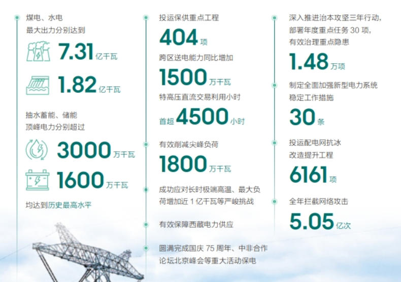 投運(yùn)保供重點(diǎn)工程404項(xiàng)、配電網(wǎng)抗冰改造提升工程6161項(xiàng),攔截網(wǎng)絡(luò)攻擊5.05億次,成功應(yīng)對(duì)長時(shí)極端高溫、最大負(fù)荷增加近1億千瓦等嚴(yán)峻挑戰(zhàn),解決配電網(wǎng)抗災(zāi)脆弱性問題,消除縣域聯(lián)系薄弱等網(wǎng)架結(jié)構(gòu)短板。