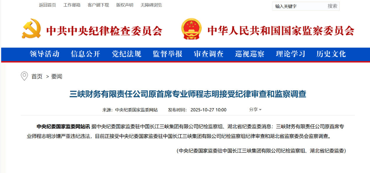 10月27日,中央紀(jì)委國家監(jiān)委網(wǎng)站信息顯示,據(jù)中央紀(jì)委國家監(jiān)委駐中國長江三峽集團(tuán)有限公司紀(jì)檢監(jiān)察組、湖北省紀(jì)委監(jiān)委消息:三峽財(cái)務(wù)有限責(zé)任公司原首席專業(yè)師程志明涉嫌嚴(yán)重違紀(jì)違法,目前正接受中央紀(jì)委國家監(jiān)委駐中國長江三峽集團(tuán)有限公司紀(jì)檢監(jiān)察組紀(jì)律審查和湖北省監(jiān)察委員會監(jiān)察調(diào)查。