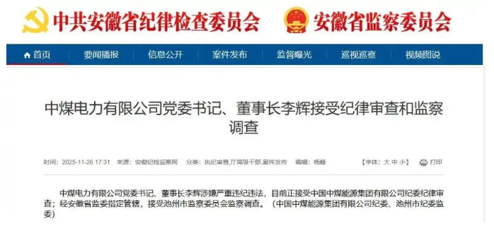 據(jù)安徽紀檢監(jiān)察網(wǎng)11月26日消息,中煤電力有限公司黨委書記、董事長李輝涉嫌嚴重違紀違法,目前正接受中國中煤能源集團有限公司紀委紀律審查;經(jīng)安徽省監(jiān)委指定管轄,接受池州市監(jiān)察委員會監(jiān)察調(diào)查。