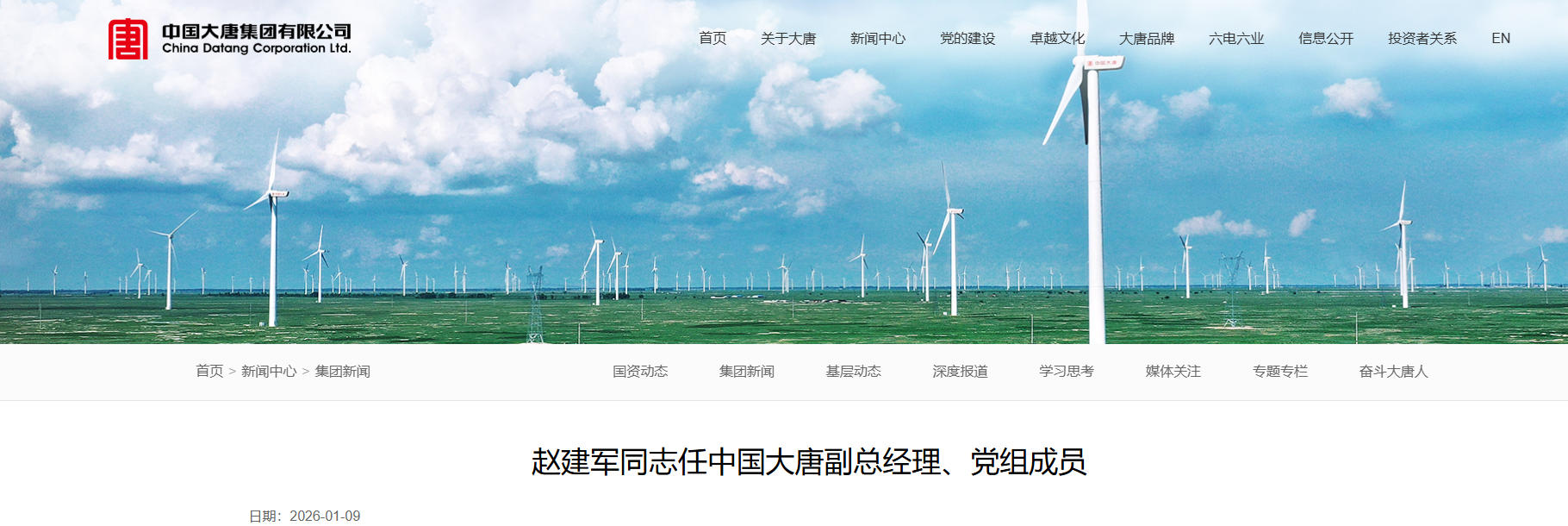 1月9日上午,中國(guó)大唐集團(tuán)有限公司召開領(lǐng)導(dǎo)班子擴(kuò)大會(huì)議,通報(bào)了中央關(guān)于趙建軍同志任中國(guó)大唐集團(tuán)有限公司副總經(jīng)理、黨組成員的決定。上述任職按有關(guān)法律規(guī)定辦理。