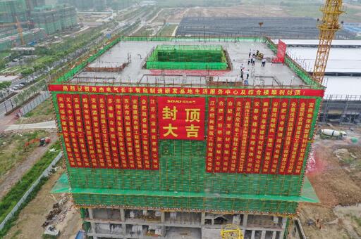 為了確保施工進度,總包方充分利用空閑時間,全員加班加點,在確保質量的同時與時間賽跑,最終如期完成生活服務中心及綜合樓中--九層辦公樓的土建工作,并于7月9日9時9分舉行了封頂儀式。