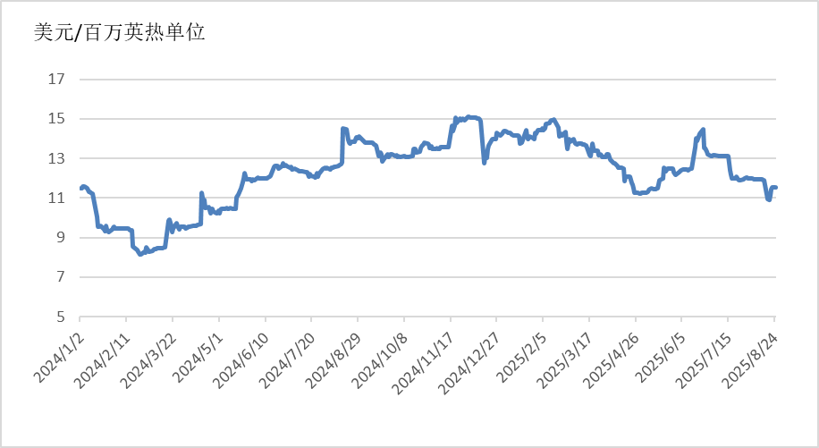 截至8月25日,美國(guó)Henry Hub天然氣主力合約收于2.709美元/百萬(wàn)英熱單位,月環(huán)比下降12.47%,相較于2024年同期的2.12美元/百萬(wàn)英熱單位,上漲27.78%。