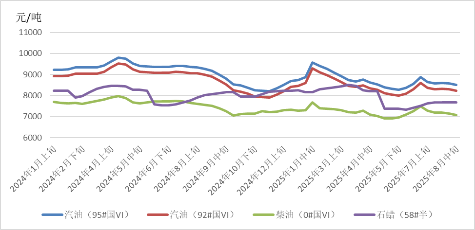 國(guó)際原油市場(chǎng):8月,受“歐佩克+”全面撤回自愿減產(chǎn)額度、美國(guó)高額關(guān)稅對(duì)各國(guó)經(jīng)濟(jì)及原油消費(fèi)造成沖擊、美國(guó)就業(yè)數(shù)據(jù)不及預(yù)期、美俄元首會(huì)晤提升市場(chǎng)對(duì)地緣局勢(shì)緩和預(yù)期以及美國(guó)夏季出游旺季結(jié)束等因素影響,全球原油市場(chǎng)過(guò)剩壓力再度顯現(xiàn),國(guó)際原油期貨價(jià)格面臨顯著下行壓力。截至8月25日,WTI、布倫特原油期貨價(jià)格分別收于64.8美元/桶、68.8美元/桶,月環(huán)比分別下降0.55%、上漲0.53%。